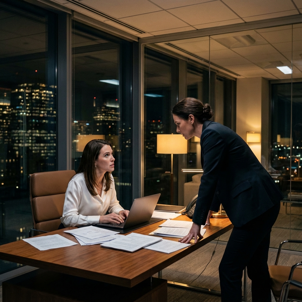 O escritório estava vazio, exceto pelo brilho azul do monitor dela e a tensão que ocupava a sala de reuniões.